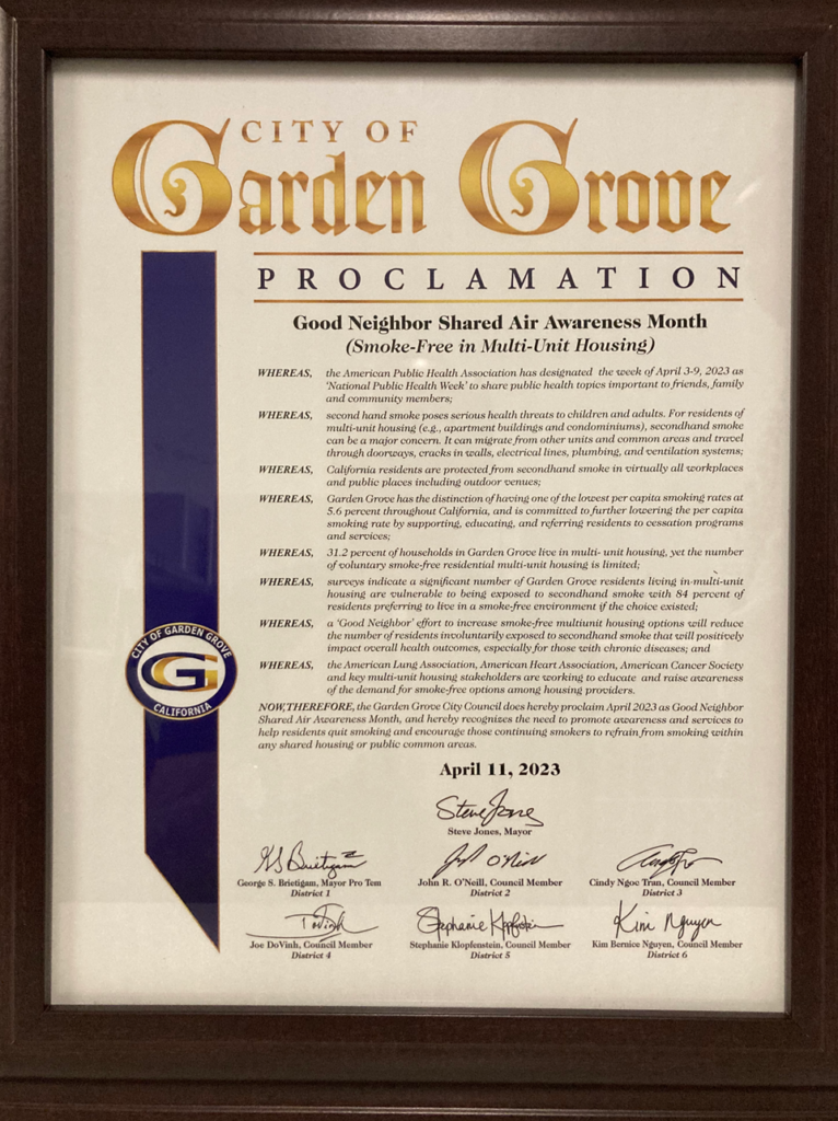 On April 11, 2023, the dedication and hard work of Waymakers Orange County’s team for smoke-free multi-family housing funding paid off with the passing of a proclamation in Garden Grove, CA to designate the month of April 2023 as “Good Neighbor Shared Air Awareness Month”. This proclamation serves as a public statement to acknowledge the issue of secondhand smoke and the need for smoke-free multi-family housing for the residents of Garden Grove. Good Neighbor Shared Air Awareness Month promotes awareness of the issue and of services to help residents quit smoking and encourage continuing smokers to refrain from smoking within any shared housing or public common areas. Waymakers’ team gathered community members of all ages to attend and speak at city council meetings as well as provide letters of support throughout March 2023 to propose and advocate for this proclamation. EVALCORP is honored to partner with Waymakers whose dedicated work is truly making a difference in our communities!